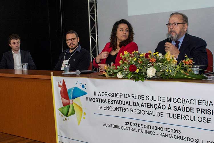 A solenidade de abertura contou com a presença do secretário Estadual de Saúde, Francisco Zancan Paz, do secretário de Saúde de Santa Cruz, Régis de Oliveira Júnior, do Superintendente da Susepe, Angelo Carneiro, do presidente da Rede Brasileira de Pesquisa em Tuberculose, Júlio Croda, da Pró-Reitora de Pesquisa e Pós-Graduação da Unisc, Andreia Valim, da professora do Programa de Pós Graduação em Promoção da Saúde da Unisc, Dra Lia Possuelo, e da delegada da 13ª Coordenadoria Regional de Saúde, Mariluci Reis.