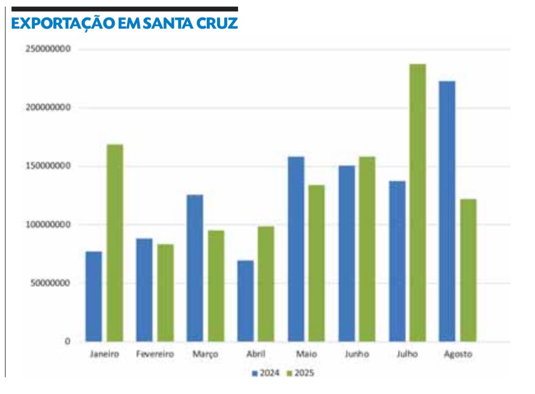 No comparativo de janeiro a agosto dos últimos dois anos, os santa-cruzenses ampliaram a exportação, em valores, em quase US$ 70 milhões. Em 2024 foi US$ 1.029.007.728,00 e em 2025, US$ 1.097.997.222.