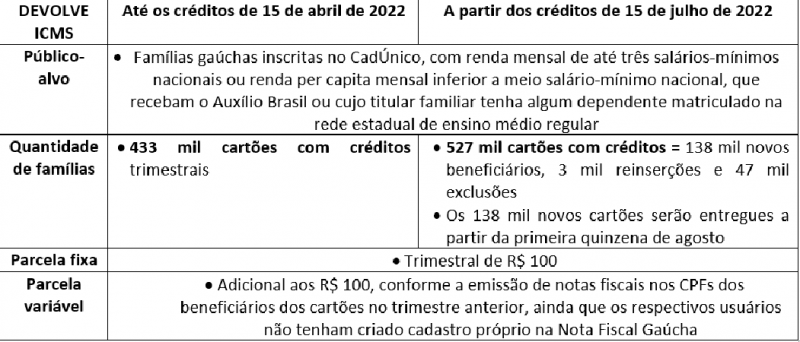 A partir de julho, há mudanças importantes no programa Devolve ICMS para as quais os beneficiários devem estar atentos, ainda que os conceitos relacionados ao público-alvo não tenham sofrido qualquer alteração. Seguem tendo direito a receber o cartão de compras as famílias gaúchas inscritas no CadÚnico, com renda mensal de até três salários-mínimos nacionais ou renda per capita mensal inferior a meio salário-mínimo nacional, que recebam o Auxílio Brasil ou cujo titular familiar tenha algum dependente matriculado na rede estadual de ensino médio regular. Mantidos esses critérios, as principais mudanças são: