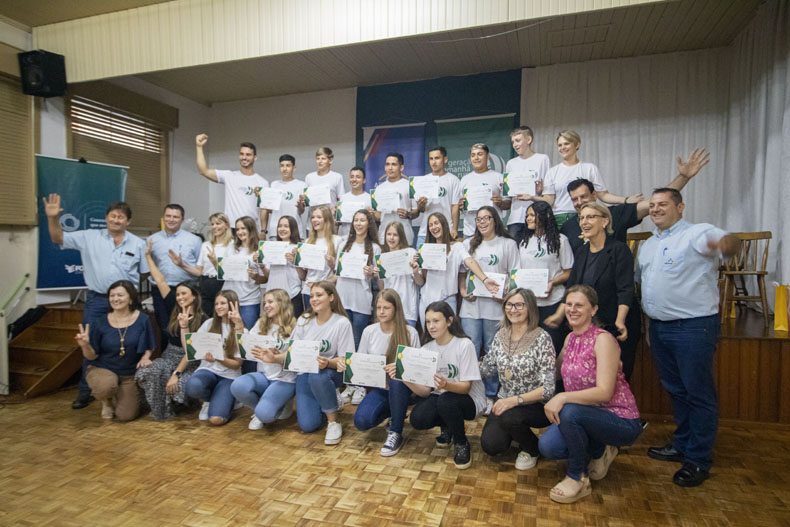 O espírito empreendedor tomou conta do auditório da Escola Municipal de Ensino Fundamental Nossa Senhora da Glória, em Sinimbu, durante a formatura de 21 estudantes que participaram do projeto Geração do Amanhã Rural. Familiares dos formandos lotaram o espaço para acompanhar a solenidade, realizada na tarde dessa quarta-feira, 6, juntamente com a prefeita Sandra Backes e a secretária municipal de Educação, Anita Brandenburg.