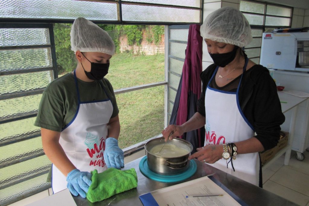 Munidos de avental, touca, luvas e máscaras, os alunos estavam atentos aos ensinamentos da chef Ana Elisa Passos, que, enquanto explicava a preparação das sobremesas, ia intercalando conhecimentos acerca das boas práticas da cozinha. Já no primeiro dia, o grupo preparou brigadeirão e manjar de coco. “Durante o curso eles vão aprender oito sobremesas e vão poder variar as receitas, usar a base de uma com o complemento de outra, fazer variações”, explicou.