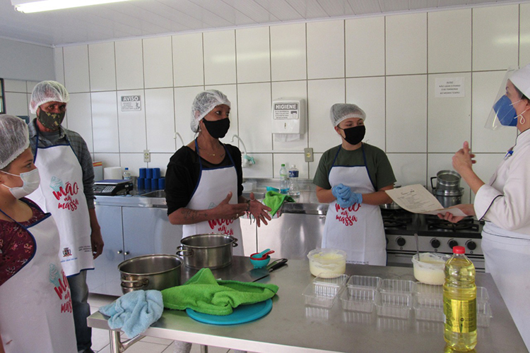Munidos de avental, touca, luvas e máscaras, os alunos estavam atentos aos ensinamentos da chef Ana Elisa Passos, que, enquanto explicava a preparação das sobremesas, ia intercalando conhecimentos acerca das boas práticas da cozinha. Já no primeiro dia, o grupo preparou brigadeirão e manjar de coco. “Durante o curso eles vão aprender oito sobremesas e vão poder variar as receitas, usar a base de uma com o complemento de outra, fazer variações”, explicou.
