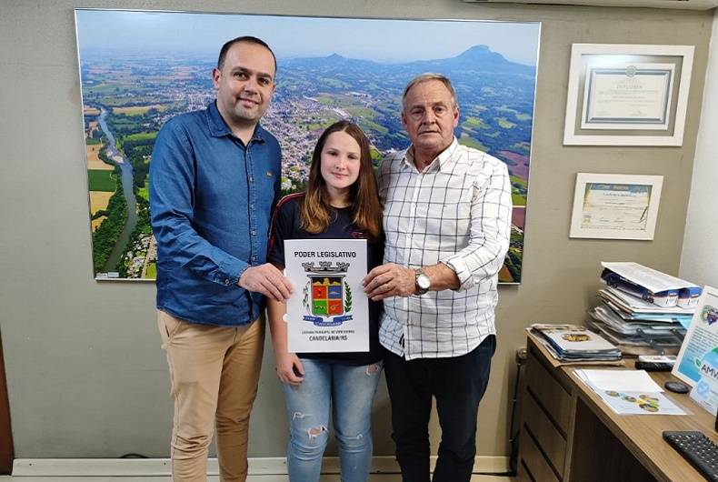 O vereador Jorge Willian Feistler (PTB) e a “vereadora mirim” Vera Lúcia Rusch, aluna da Escola Professor Dinarte, estiveram na sede do Poder Executivo Municipal para entregar ao prefeito Nestor Ellwanger a indicação para que seja criado o Conselho Municipal da Juventude (Comjuve) em Candelária.
