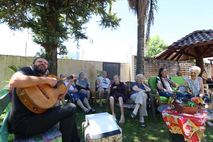 Prestando atenção na voz grave e na batida do violão mostradas pelo músico Marcelo Mayer durante a ação no pátio da clínica geriátrica Bem-Estar, a residente Cristina Santos, de 63 anos, afirmou gostar quando atividades ao ar livre são propostas para eles. “É muito bom sair de dentro de casa, com o clima bom e agradável como nessa tarde, então fico feliz”, ressaltou Cristina. Ela lembrou dos bingos, lanches, rodas de chimarrão e outras atividades que a Bem-Estar promove no pátio.