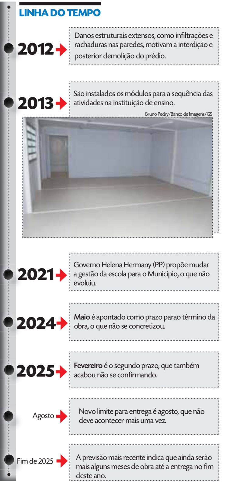 A história de expectativa da comunidade escolar começou em 2012. Naquele ano foram identificados danos na estrutura, com infiltrações e rachaduras na parede, que levaram à condenação e consequente derrubada do prédio. As aulas iniciaram-se no ano seguinte, no modelo modular, feito com o uso de contêineres.