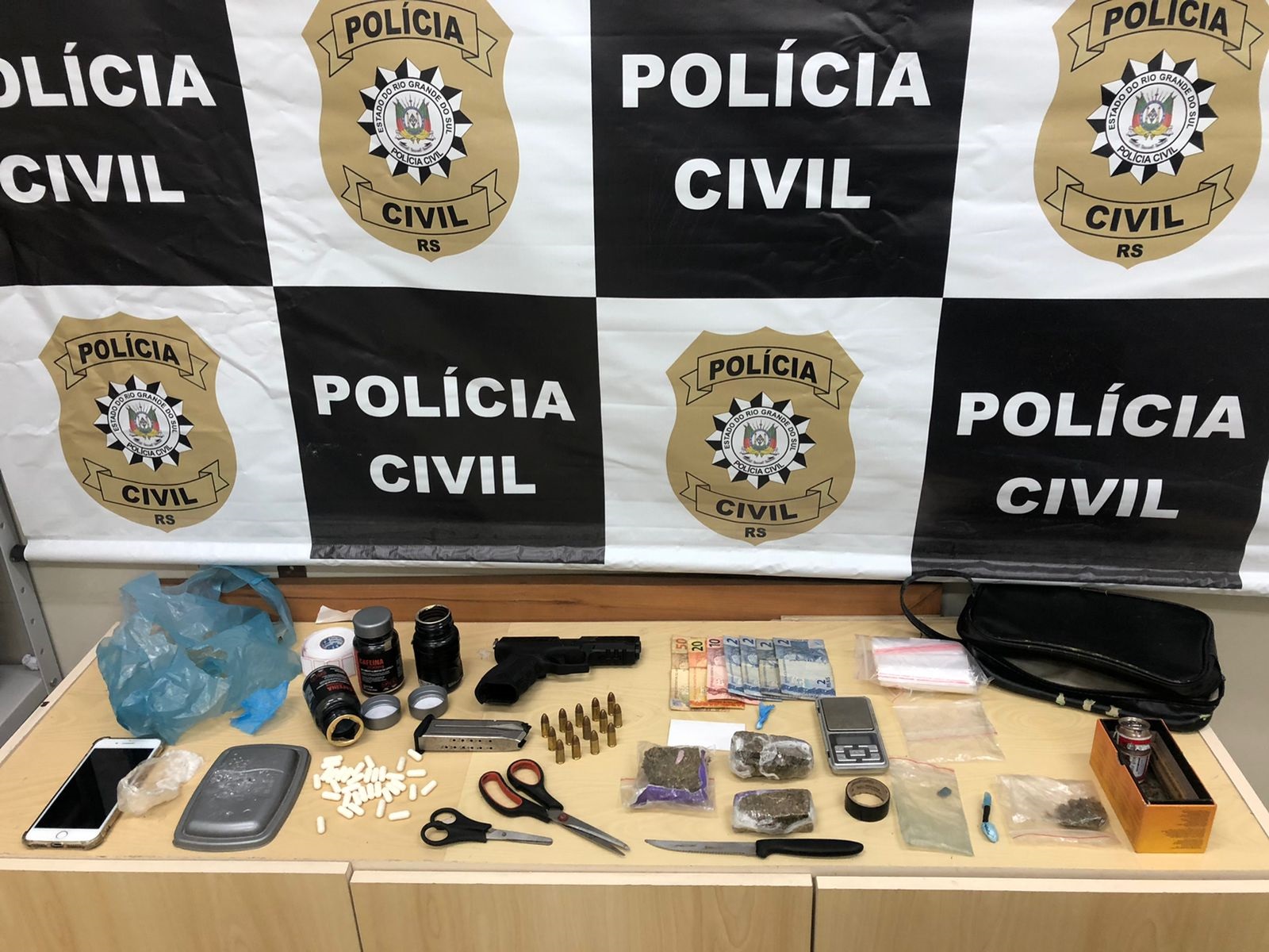 Na ação, foram apreendidos uma pistola 9 milímetros de fabricação turca com seletor de rajadas e municiada com 14 cartuchos; três tabletes de maconha, duas porções de cocaína, um comprimido de ecstasy, sacos para embalagem de drogas, uma balança de precisão e diversos comprimidos dentro de um pote de cafeína. O material será periciados para confirmar se é cafeína ou cocaína.