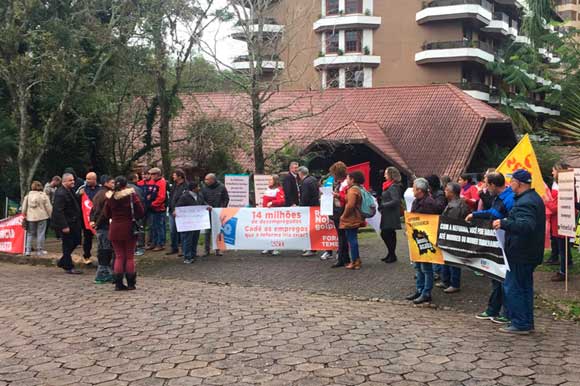 O Hotel Águas Claras, que sedia a Jornada Brasileira de Relações do Trabalho, também é palco de um protesto contra a reforma trabalhista no início da tarde desta segunda-feira, 9. A manifestação, organizada pela Central Única dos Trabalhadores (CUT), reúne cerca de 30 pessoas em frente ao hotel, no Bairro Higienópolis, em Santa Cruz do Sul.