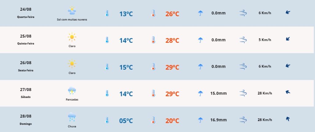 No sábado, 27, o tempo vai mudar. A chuva chega e são esperados cerca de 15 milímetros. Os termômetros vão marcar 14 graus de mínima e 29 graus de máxima. No domingo, 28, a previsão é de mais 16,9 milímetros de chuva. Em seguida, a temperatura deve cair significativamente, com a mínima ficando em 5 graus e a máxima em 20.