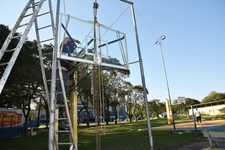 Uma das quadras esportivas ao ar livre do Parque da Oktoberfest está recebendo novas tabelas de basquete. O trabalho começou a ser executado pela Secretaria de Habitação, Desenvolvimento Social e Esporte (Sehase) nesta segunda-feira, 23.