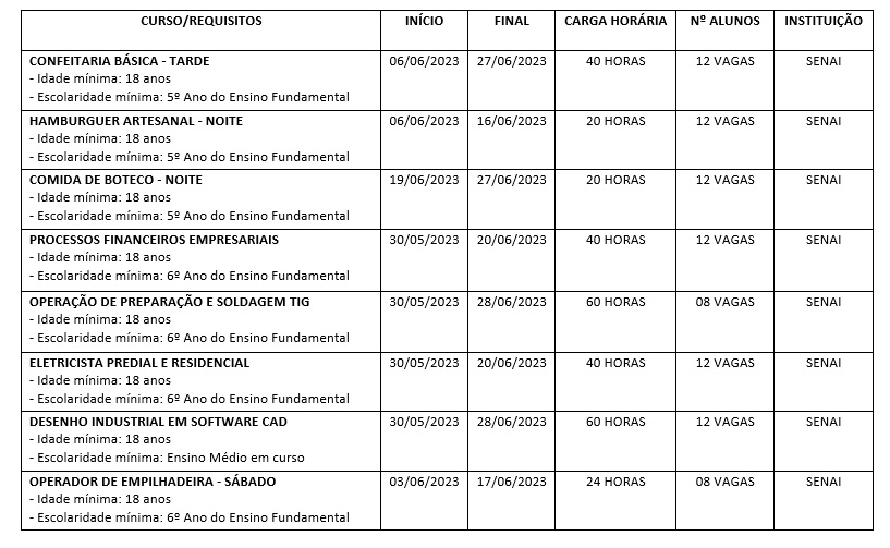Conforme o secretário de Desenvolvimento Econômico, Trabalho e Turismo, Nelsoir Batisti, nesta etapa de formação serão cursos ministrados pelo Senai, a partir da contratação dos serviços por parte do município. As inscrições deverão ser feitas a partir das 8 horas, no espaço Venâncio Empreendedor que fica na Rua Tiradentes, 1.060, conforme a ordem de chegada dos candidatos.
