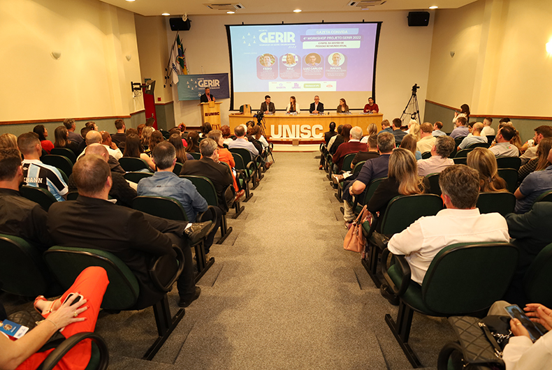 O papel da gestão de pessoas no mundo atual foi o tema da quarta edição de 2022 do Projeto Gerir – Workshops de Gestão Organizacional, realizada na noite desta terça-feira, 27, no Auditório do Memorial da Universidade de Santa Cruz do Sul (Unisc). O espaço teve lotação máxima para acompanhar o debate e a troca de ideias entre os profissionais convidados, que são reconhecidos em suas áreas de atuação. A mediação foi da jornalista Maria Regina Eichenberg, comunicadora da Rádio Gazeta FM 107,9 FM.
