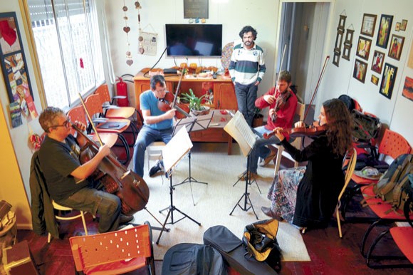 Rodrigo Ribeiro, conhecido por seu desempenho como ator e diretor de teatro – muito especialmente em função de seu espetáculo mais recente, O Professor Pelado –, agora é também produtor cultural. É ele quem nos apresenta – e está agenciando – o mais novo quarteto de cordas gaúcho, o Sarabande, nascido aqui mesmo, em Santa Cruz do Sul. Segundo Rodrigo, é uma formação instrumental bastante utilizada em se tratando de música clássica. O quarteto é integrado por dois violinos, tocados por Ana Paula Kahmann e Gabriel de Conto Trapp; uma viola, por Célio Elgert; e um violoncelo, por Jairo Vilmar Padilha.