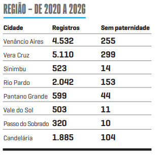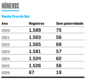 Em Santa Cruz, desde 2020 até o último dia 20, dos 9.415 nascimentos, 393 registros não receberam o nome do pai. Neste ano, de janeiro até agora já são 19 registros somente com o nome da mãe.