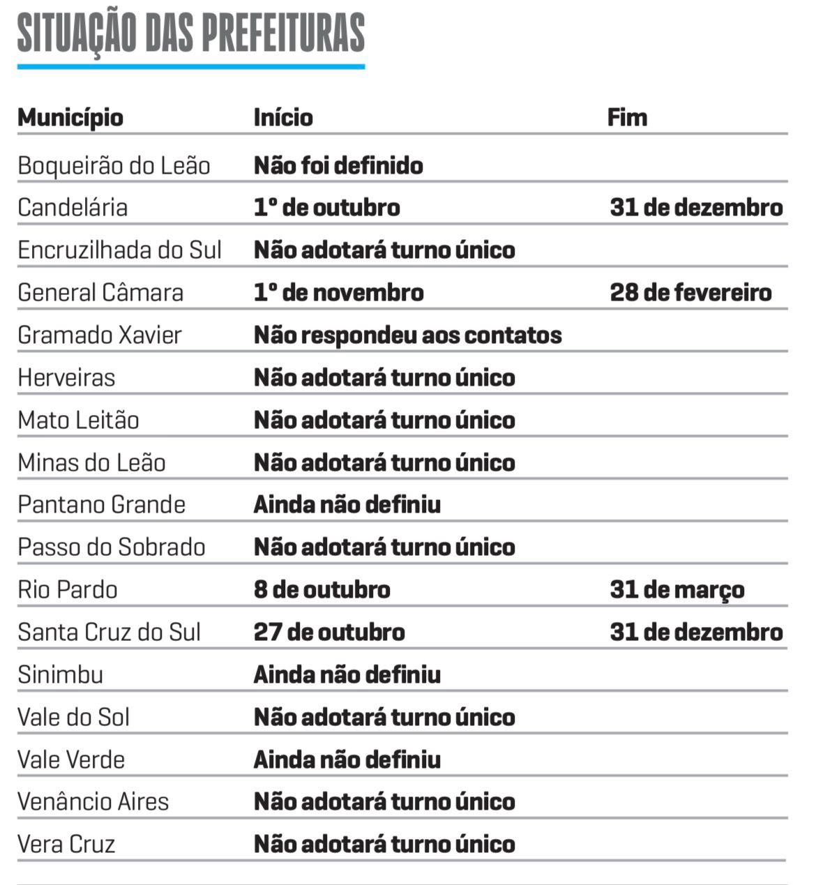 Candelária, General Câmara, Rio Pardo e Santa Cruz do Sul optaram por essa estratégia de equilíbrio. O maior período será no serviço público rio-pardense. Entre os dias 8 de outubro e 31 de março do próximo ano, os servidores atenderão das 8 às 14 horas. A exceção fica por conta dos serviços essenciais, como na Saúde e na Educação e na coleta de lixo.
