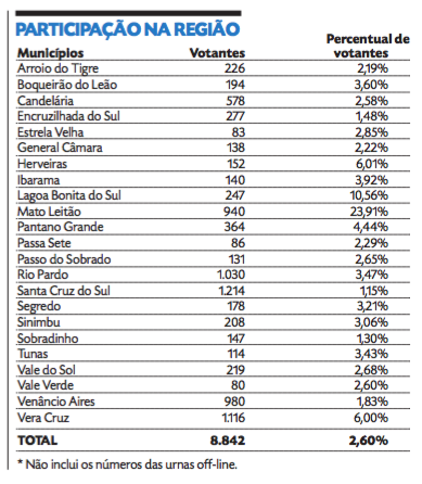 O presidente do Conselho Regional de Desenvolvimento (Corede/VRP), Heitor Álvaro Petry, ressalta que nesta sexta-feira os Conselhos Municipais de Desenvolvimento (Comudes) terão um papel importante de mobilização para a reta final da votação. Os municípios com índices mais baixos até agora são Santa Cruz do Sul, Sobradinho, Encruzilhada do Sul e Venâncio Aires. Com maior participação se destacam Mato Leitão, Lagoa Bonita do Sul, Herveiras e Vera Cruz.