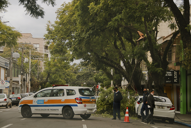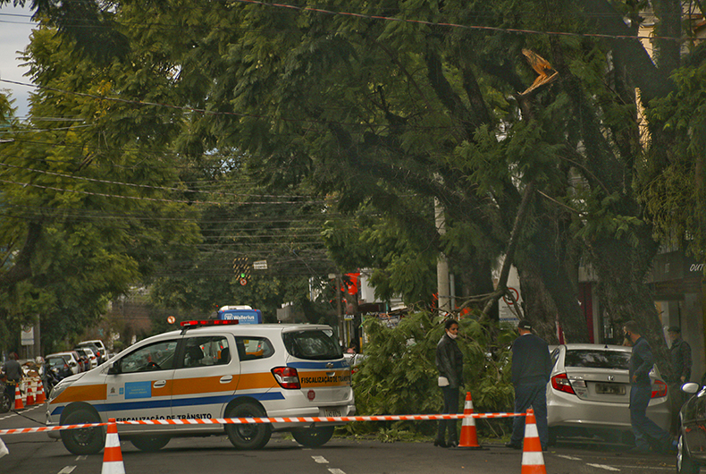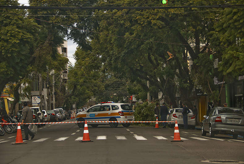 A queda de um galho causou a interrupção do trânsito na Rua Tenente Coronel Brito, no Centro de Santa Cruz do Sul, no fim da manhã desta terça-feira, 8. A situação ocorreu na quadra entre as ruas 28 de Setembro e Júlio de Castilhos.