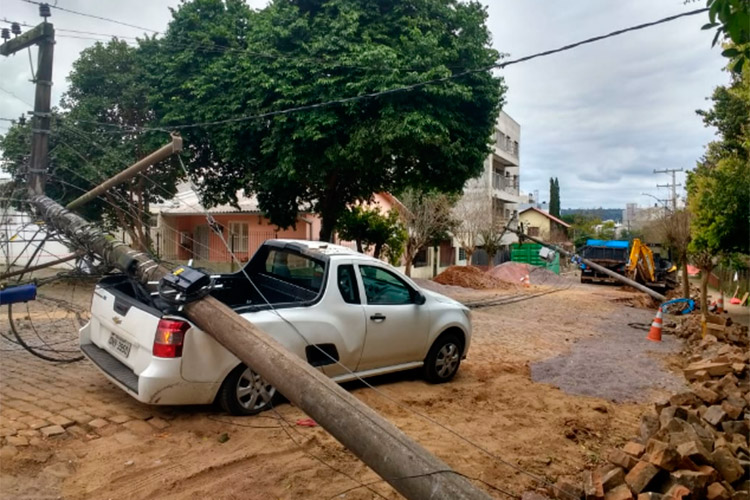 Dois postes da rede elétrica caíram na Rua Rio Branco, no Centro, por volta das 11 horas, depois que funcionários da empresa Hidro Brasil, contratada pela Companhia Riograndense de Saneamento (Corsan) abriram um buraco no local para instalar uma nova rede de água. Um dos postes caiu sobre uma GM Montana, mas ninguém ficou ferido.
