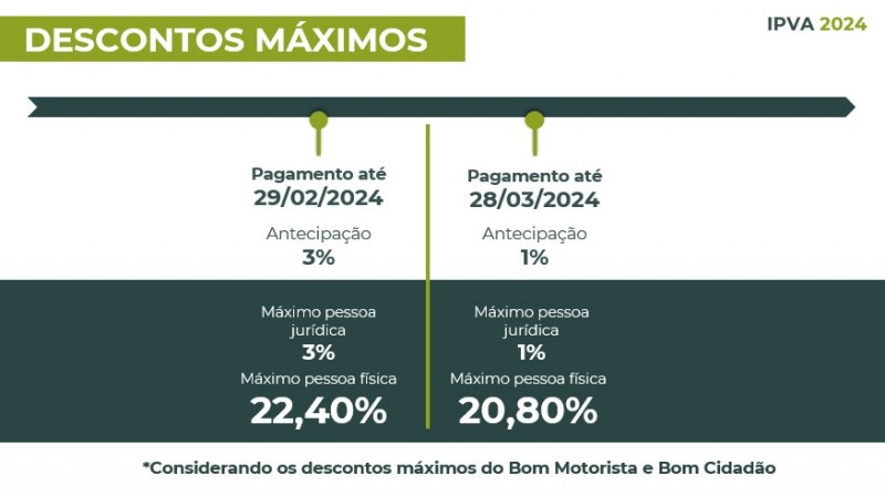 Proprietários de veículos que realizarem a quitação até o dia 29 de fevereiro terão economia com o pagamento do IPVA 2024. O desconto é de 3% pela antecipação. Além disso, os contribuintes também podem obter os descontos de Bom Motorista e de Bom Cidadão. Se tiverem direito a eles, poderão agregar descontos que chegam a 22,40%.