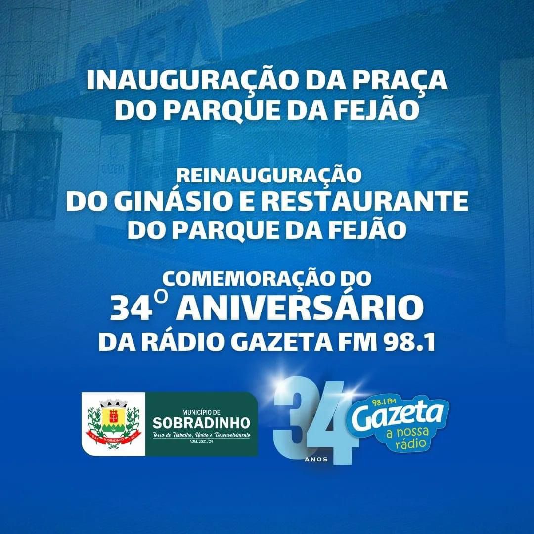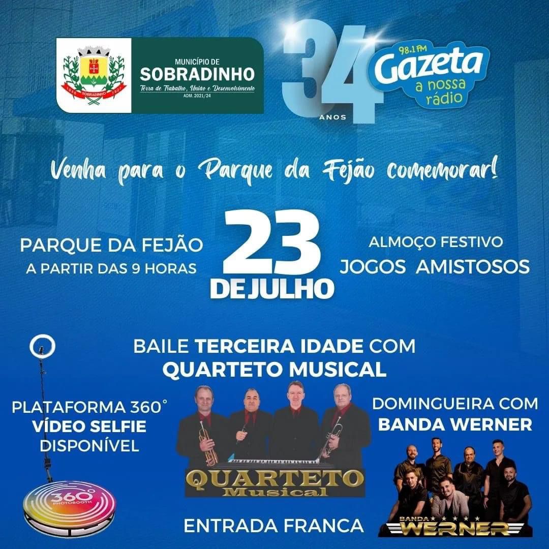 Para comemorar os 34 anos de tradição, a Gazeta Sobradinho convida você, sua família e amigos a participarem dessa grande festa. Será neste domingo, 23 de julho, a partir das 9h, no Parque Marci Luiz Nardi (Parque da Fejão).