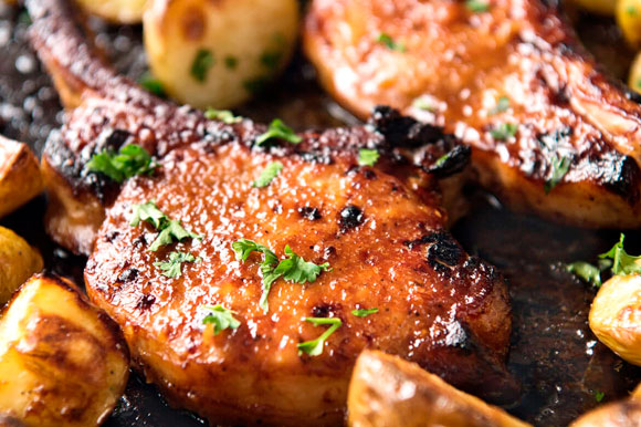 Misture os temperos todos numa vasilha. Lambuze as chuletas de porco com a mistura dos dois lados, depois tempere com sal e pimenta. Corte as batatas pela metade. Acomode tudo num refratário untado com óleo de girassol e leve ao forno pré-aquecido a 200 graus para assar por cerca de 40 minutos. Retire e sirva numa badeja e regue a carne com o líquido do refratário e salpique com a salsinha. Sirva na companhia de uma salada de agrião e legumes salteados em oliva.
