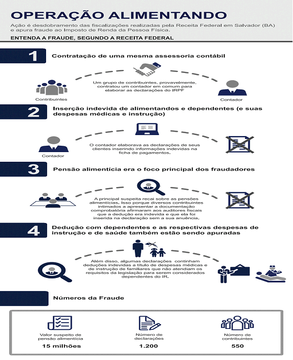 A Receita Federal identificou que cerca de 1.200 declarações do Imposto de Renda da Pessoa Física, dos exercícios de 2015 a 2019, de um grupo de aproximadamente 550 contribuintes e que foram transmitidas de um mesmo computador, continham deduções relacionadas à pensão alimentícia e inclusão de dependentes e também de despesas médicas e de instrução referentes a eles, em desacordo com o que prevê a legislação. Desse modo, os contribuintes obtinham a redução do valor do imposto a pagar ou o aumento da restituição.