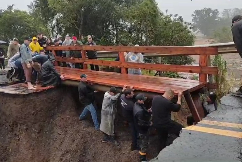 A passarela de madeira construída por moradores para permitir a passagem pela ponte sobre o Rio Pardo, no quilômetro 137 da RSC-287, no acesso a Candelária, gerou uma das cenas mais emblemáticas de tantas que a enchente já proporcionou. Após alertas da concessionária responsável pela rodovia de que a estrutura apresentava riscos, às 16h26 de domingo, Dia das Mães, um caminhão com cabos de aço acelerou sobre a pista enquanto a chuva fina insistia em cair. Em poucos segundos, a madeira foi arrancada e a cidade voltou a ficar isolada.