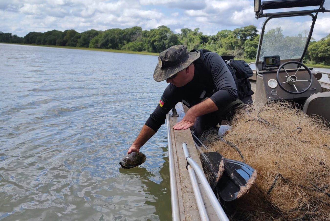 Foram retiradas das águas do Rio Velho 12 redes de pesca – cerca de 600 metros – que estavam em desacordo com a lei ambiental. Os proprietários do material não foram localizados. Também foi feita a devolução à água de três tartarugas e 10 peixes das espécies biru e piava. Na ação, os policiais também abordaram e fiscalizaram duas embarcações de pequeno porte e uma draga de mineração de areias.
