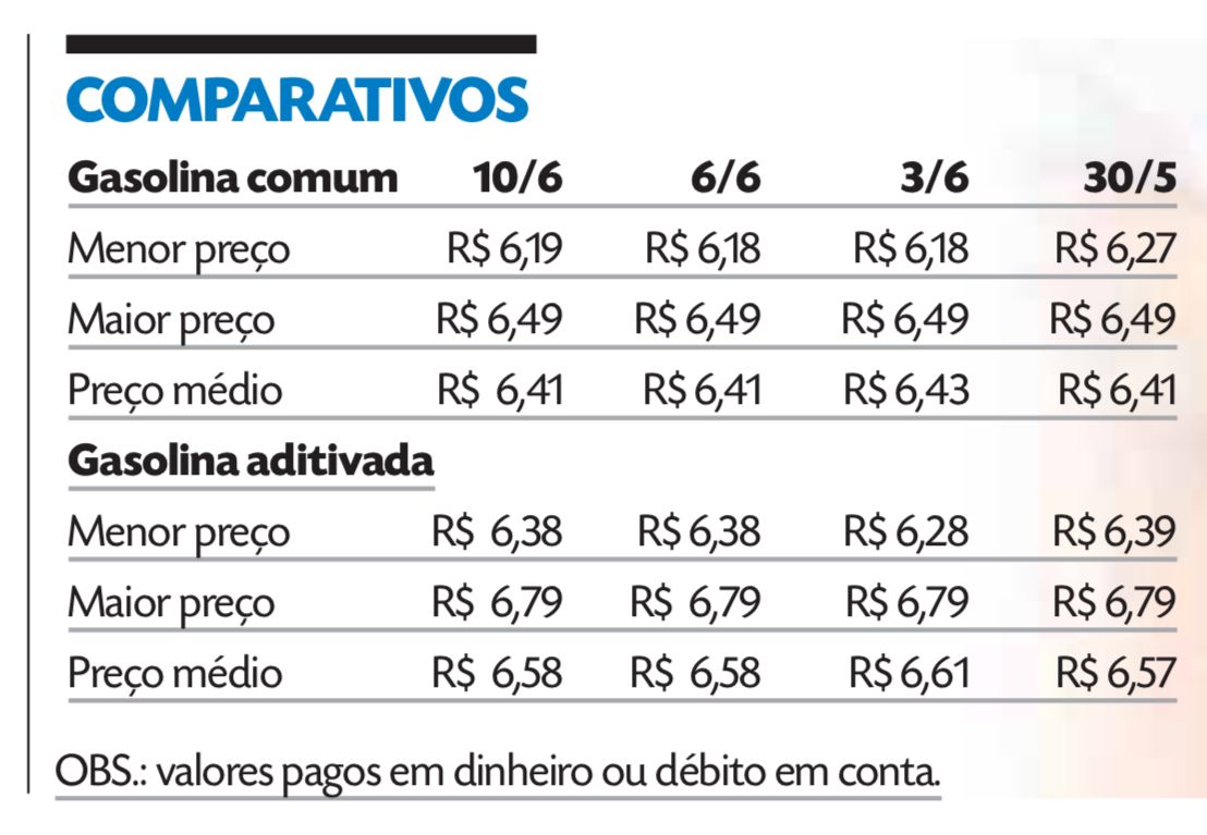 Segundo o levantamento do Procon de terça, os menores preços da gasolina comum foram R$ 6,19 e os maiores, R$ 6,49. Com isso, a economia chega a R$ 15,00 no abastecimento de um veículo com tanque de 50 litros. O valor aumenta para R$ 20,50 nas pesquisas para gasolina aditivada, onde o menor valor foi de R$ 6,38 e o maior, R$ 6,79.