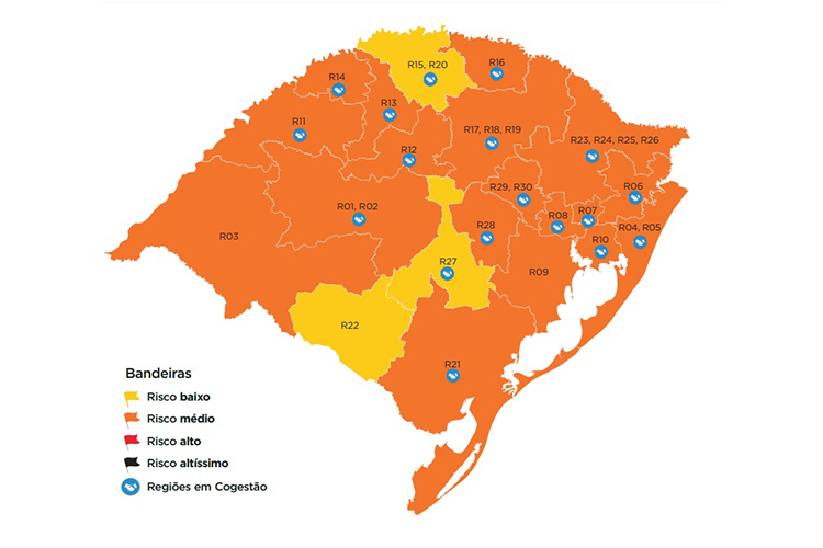 Ainda estão em bandeira amarela, a região de Bagé e Palmeira das Missões. A região de Pelotas regrediu para bandeira laranja devido ao registro de novas hospitalizações por Covid-19, também ocorreu agravamento do indicador que mede os casos de SRAG em leitos de UTI, que passou de 36 para 42 internados na comparação de uma quinta-feira para outra.