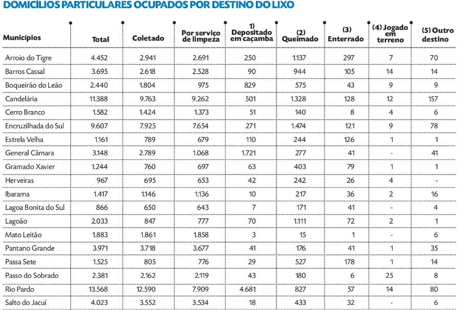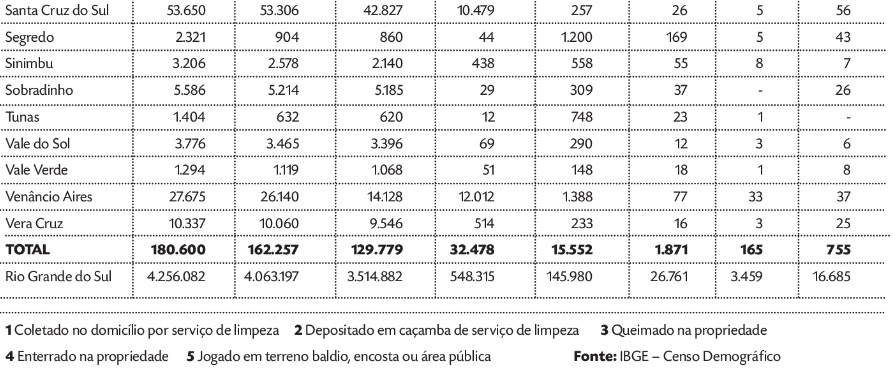 A queima na propriedade ainda é o destino do lixo de grande parte da população residindo em domicílios de Lagoão (54,65%), Tunas (53,28%), Segredo (51,7%), Passa Sete (34,56%) e Gramado Xavier (32,4%). Nessa categoria, os índices mais baixos são os de Santa Cruz do Sul (0,48%), Mato Leitão (0,8%) e Vera Cruz (2,25%). Nas soluções locais ou individuais para a destinação do lixo, ainda se destacam na região os municípios de Estrela Velha e Passa Sete, onde 10,85% e 11,67% dos domicílios, respectivamente, realizam o enterro nas propriedades.