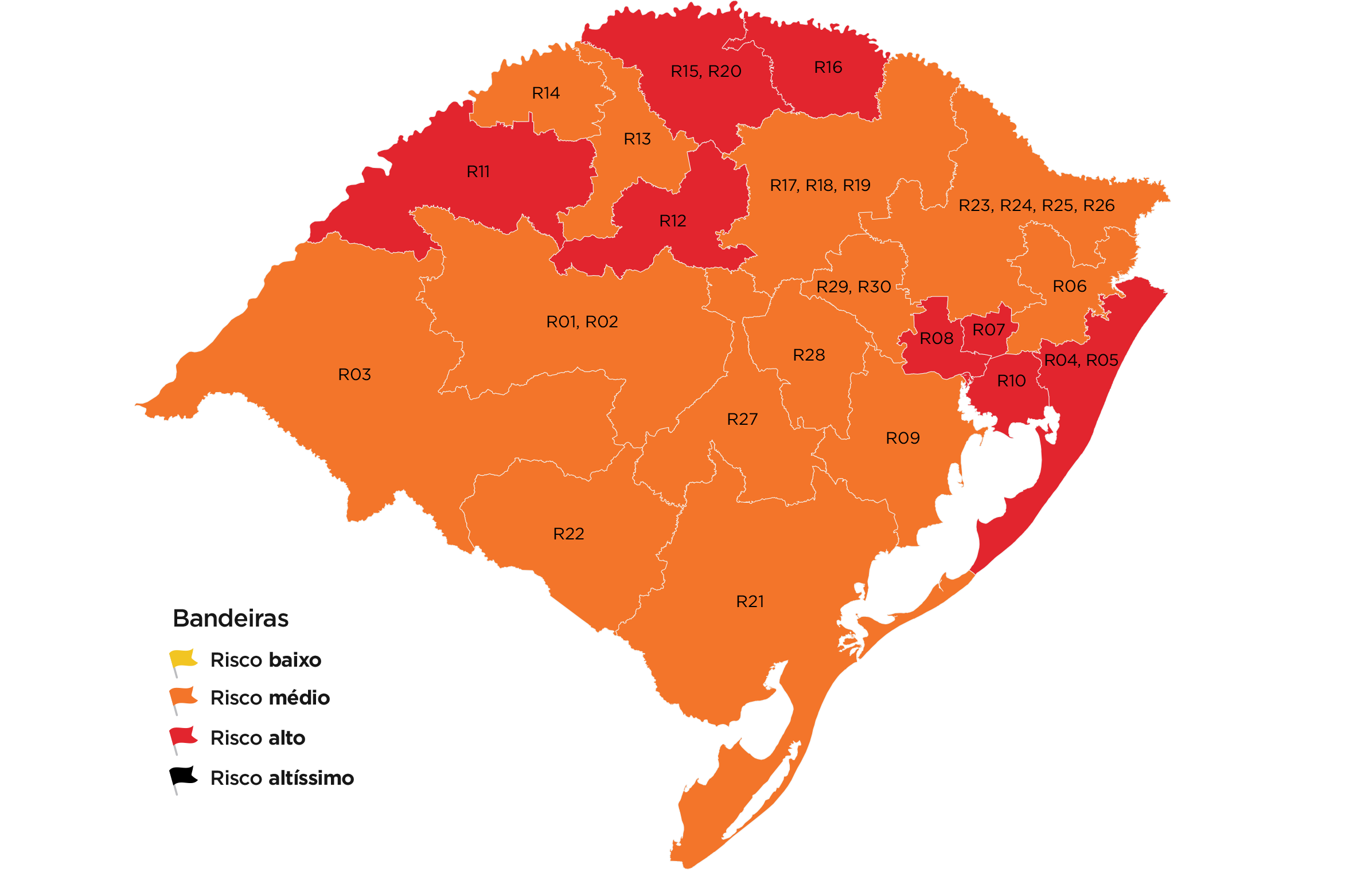 No total, são 17 regiões que integram a cogestão: Capão da Canoa, Taquara, Novo Hamburgo, Canoas, Porto Alegre, Santo Ângelo, Cruz Alta, Ijuí, Santa Rosa, Palmeira das Missões, Passo Fundo, Pelotas, Caxias do Sul, Cachoeira do Sul, Santa Cruz do Sul, Lajeado e Erechim. As que estão classificadas em laranja podem adotar protocolos flexíveis, desde que não menos restritivos do que os de bandeira amarela.