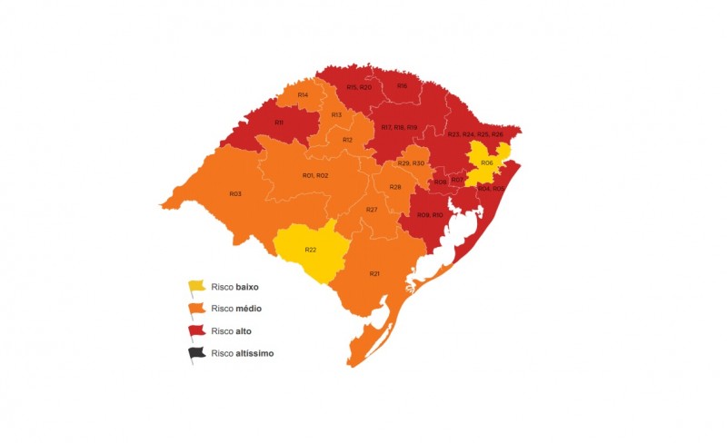 As regiões de Porto Alegre, Canoas, Novo Hamburgo e Capão da Canoa permanecem em bandeira vermelha pela segunda semana consecutiva. A região de Caxias do Sul, que esteve em bandeira vermelha na semana retrasada e em laranja na semana que se encerra, retorna à bandeira vermelha.