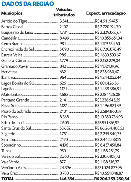 O município de Santa Cruz do Sul é responsável por 41,8% da arrecadação do Vale do Rio Pardo e Centro-Serra, com 36,6% de toda a frota tributável da região. Venâncio Aires aparece em segundo no ranking regional do imposto (15%), seguido de Candelária (5,2%), Vera Cruz (5,1%) e Rio Pardo (5%). Os valores mais baixos da estimativa de recolhimento do tributo ficam com Lagoa Bonita do Sul e Herveiras, ambos com 0,4% do total da região.