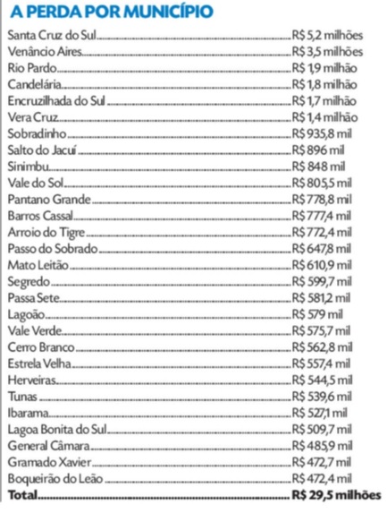 Conforme uma projeção da Confederação Nacional dos Municípios (CNM), o impacto sobre as receitas dos governos locais pode chegar a R$ 658,3 milhões no Rio Grande do Sul e a R$ 9,3 bilhões anuais em todo o país. Na região, somente a Prefeitura de Santa Cruz do Sul teria uma perda superior a R$ 5 milhões, enquanto a de Venâncio Aires perderia R$ 3,5 milhões.
