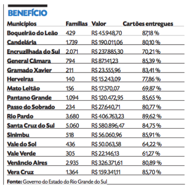 O levantamento da Sefaz mostra que 85,41% das famílias beneficiadas têm como responsáveis mulheres, a maior parte na faixa etária entre 31 e 40 anos e com renda familiar de até R$ 353,00. Para ter direito aos repasses, é necessário o cartão do cidadão. Em alguns municípios da região, a procura por esse documento foi baixa, como em Vale Verde, que ficou em 61,27%. Rio Pardo atingiu maior percentual, com 3.680 famílias e 89,62%.