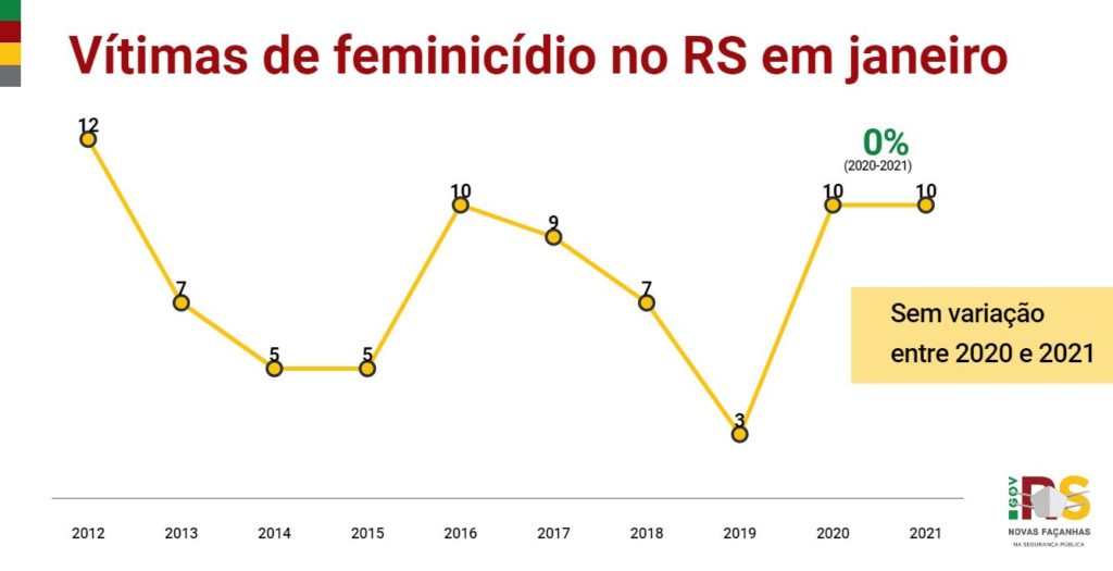 O Rio Grande do Sul teve, em 2020, o segundo ano consecutivo de redução nos registros de feminicídios. Em janeiro de 2021, os dados divulgados pela Secretaria Estadual da Segurança Pública nesta quinta-feira, 11, indicam estabilidade. Foram 10 casos nos 31 primeiros dias do ano, mesmo número registrado em janeiro de 2020.
