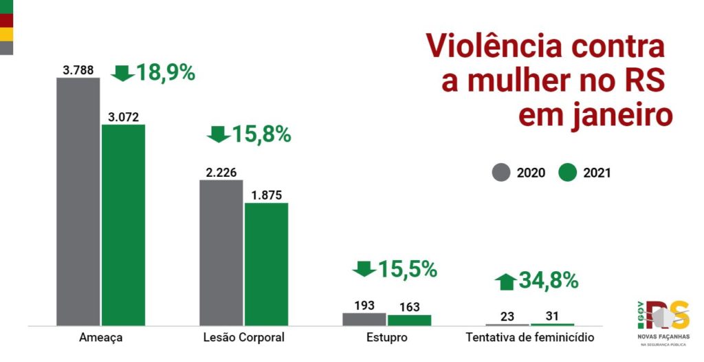 O número de tentativas de feminicídio, no entanto, cresceu. Foram 31 em janeiro de 2021, contra 23 no mesmo mês do ano anterior. Por outro lado, em outros indicadores relacionados à violência contra as mulheres houve redução.