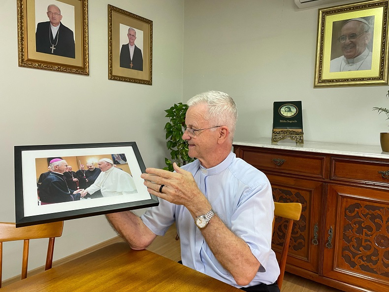 Do outro lado do oceano, no Rio Grande do Sul, o bispo emérito dom Aloísio Alberto Dilli admira o retrato que eternizou o momento em que encontrou o papa Francisco. Em 8 de maio de 2022, o então líder religioso da Diocese de Santa Cruz do Sul esteve no Vaticano com outros 25 bispos gaúchos para encontrar o Santo Padre.