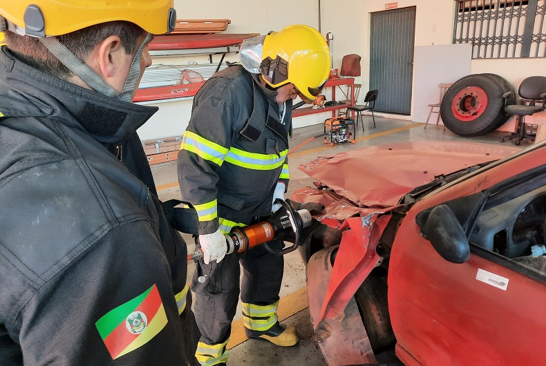Após serem instruídos a respeito dos primeiros socorros, os integrantes do grupo 2, no qual eu me incluía, foram para o pátio aprender sobre o uso das ferramentas utilizadas em acidentes veiculares. O segundo-sargento Éder Porto Ferreira e o soldado Fabiano Kroth dos Santos apresentaram o tão usado desencarcerador. É um equipamento conhecido, muito empregado em resgates de vítimas durante graves acidentes, para expandir ou abrir compartimentos fechados mediante corte.
