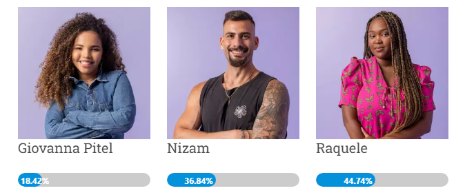 O público do Portal Gaz também votou na enquete, que dá uma ideia do que pode acontecer no programa, já que não tem influência sobre o resultado oficial do paredão. Entre os leitores do Gaz, quem teve menos votos e deve deixar a casa neste domingo é Giovanna Pitel, que teve somente 18,42% dos votos.