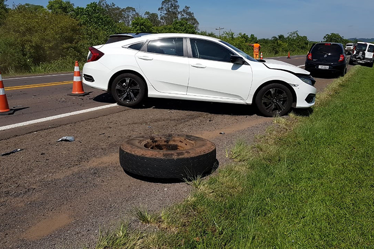 Um caminhão com placas da Capital acompanhava uma equipe da RGS Engenharia, que se deslocava para Venâncio Aires, quando perdeu a roda de um reboque, que acabou atingindo o carro.