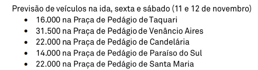 Conforme uma projeção da Concessionária Rota de Santa Maria – que administra a RSC-287 – os melhores horários para trafegar pelas praças de pedágio de Venâncio Aires, Candelária, Taquari, Paraíso do Sul e Santa Maria são até às 15 horas e após às 19 horas desta sexta-feira, 11. Já no sábado, 12, a movimentação tenda a ser menor até às 8 horas e após às 11 horas da manhã.