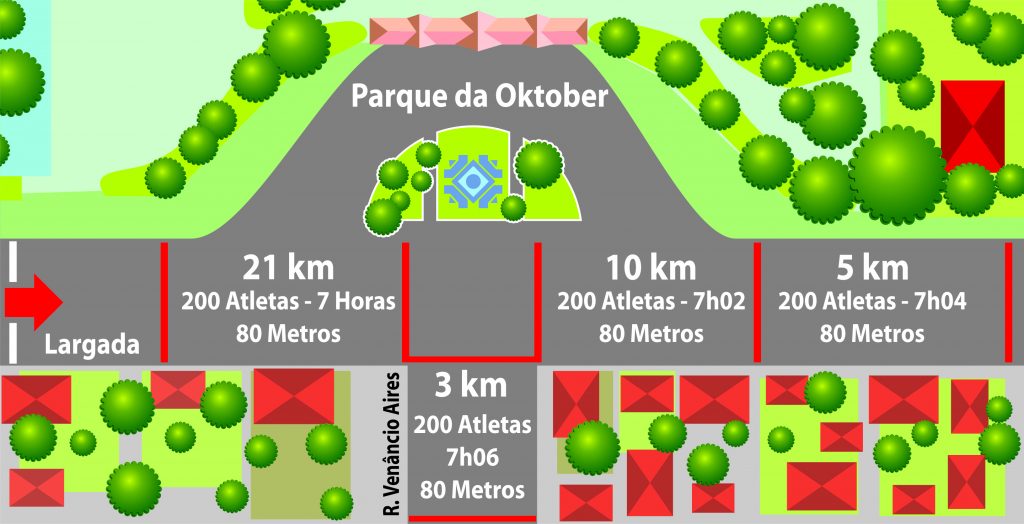 A estrutura para largada e chegada será montada na região do chafariz, em frente ao Parque da Oktoberfest, na Rua Galvão Costa. A área será dividida em gradis, e cada bloco, conforme a distância, terá 200 atletas (confira o mapa abaixo). As largadas acontecerão a cada dois minutos. Os atletas devem cumprir os protocolos sanitários previstos no regulamento. Um carro-madrinha fará a orientação do percurso e uma ambulância acompanhará o último atleta em cada prova. Os detalhes estão em eventosesportivos.gaz.com.br.