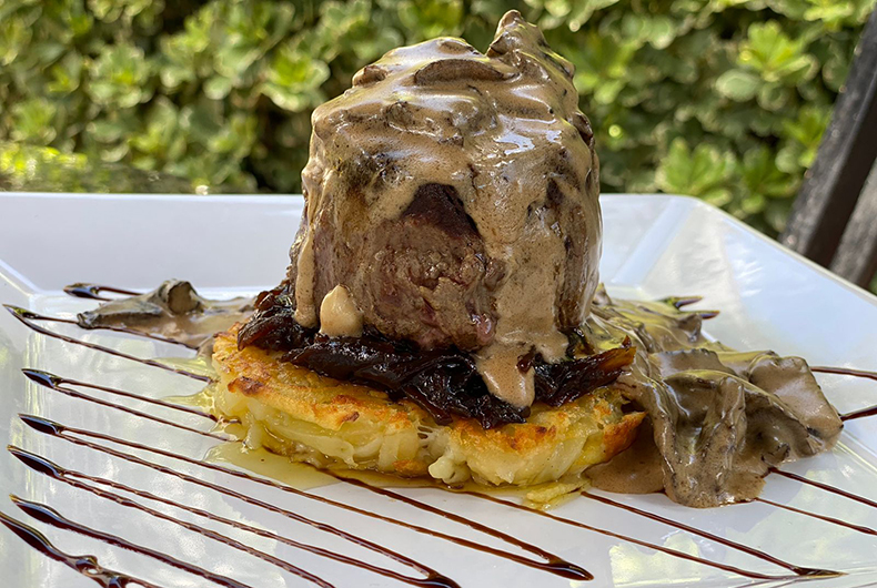 Em um prato, coloque uma porção de batata rosti. Em seguida, sobreponha uma porção de cebola caramelizada e, na sequência, o filé sobre a cebola. Por último, cubra o filé com o molho.