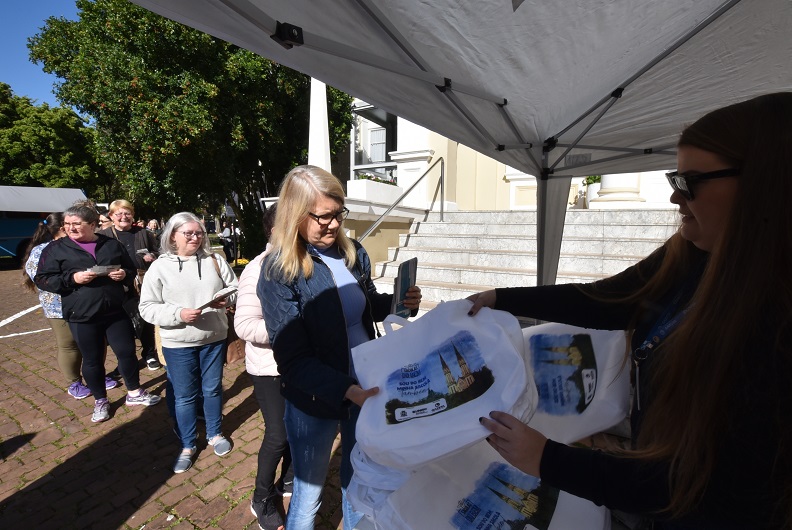 A entrega de mais um lote das Sacolas do Bem movimentou o começo deste sábado, 24, no Centro de Santa Cruz do Sul. Em cerca de 15 minutos, foram esgotadas as 300 unidades disponíveis na troca dos cupons recortados da Gazeta do Sul dos números 31, 32, 33, 34 e 35/2022. O início da distribuição começou às 9 horas. Quem foi prestigiar a ação recebeu ainda cucas oferecidas pela Prefeitura de Santa Cruz do Sul.