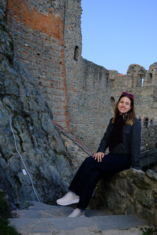 Visitei a Sacra di San Michele enquanto leio O Nome da Rosa. Foi como atravessar um portal: entrei nos mistérios do livro e me senti parte da própria história. E, ao mesmo tempo, estremeci diante da força da arquitetura. Desde a entrada, a fachada de 41 metros se impõe. Alguns passos adiante, aparece a “Escada dos Mortos”: uma longa escadaria de pedra medieval ladeada por tumbas que, até pouco tempo atrás, guardavam os ossos dos monges. Seguindo, chegamos ao Portal do Zodíaco, formado por fragmentos de mármore. À direita, os signos do zodíaco surgem em relevo, como leões, peixes, caranguejos e águias, enquanto à esquerda sucedem-se as constelações boreais e austrais. Ao sair para a área externa, encontramos grandes colunas e arcos que sustentam o peso colossal da abadia no topo da montanha.