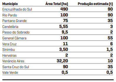 Outros municípios com participação relevante são Pantano Grande, com 75 hectares e 35 toneladas; Santa Cruz do Sul, com 90 hectares e 35 toneladas; e Venâncio Aires, com 32,2 hectares e 10 toneladas. A produção regional ainda inclui volumes menores, mas distribuídos em diversas localidades, como Vera Cruz, com 6 toneladas; Candelária, com 3; Passo do Sobrado, 2; Sinimbu, com 1,5; Herveiras, 2; e Vale Verde, 0,5.