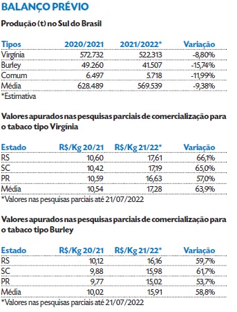 O Departamento de Pesquisa e Estatística da Associação dos Fumicultores do Brasil (Afubra) está na reta final da pesquisa dos números da safra de tabaco 2021/2022. Porém, os números somente serão concluídos na segunda quinzena de agosto. A estimativa é de uma produção de 569.539 toneladas de tabaco nos três Estados do Sul. O presidente da Afubra, Benício Albano Werner, lembra que, em janeiro, houve uma perspectiva de a produção ser menor, em virtude da estiagem. Entretanto, com a volta das chuvas nas regiões que produzem mais tarde, o tabaco se recuperou e a produção se mantém na estimativa inicial.