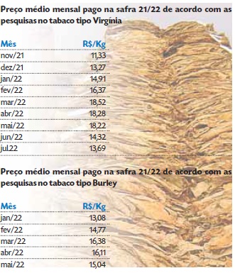 Sobre os preços praticados na safra 2021/2022, Werner lembra que os valores divulgados pela Afubra são de preços médios. “São valores médios apurados por meio de pesquisa e informados pelos fumicultores. Tem produtores que receberam mais e tem outros que receberam menos.” A atualização dos valores médios praticados é realizada semanalmente, com a inclusão de mais pesquisas realizadas com os fumicultores do Rio Grande do Sul, Santa Catarina e Paraná.