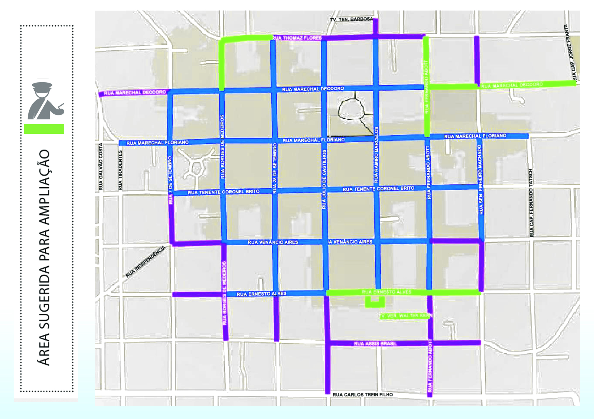 Três exemplos de trechos que passarão a ter a cobrança são a Rua Assis Brasil, entre Senador Pinheiro Machado e Júlio de Castilhos, a Rua Borges de Medeiros, entre Assis Brasil e Venâncio Aires, ambos na Zona Roxa e ainda, a Rua Ernesto Alves, entre as ruas 28 de Setembro e Borges de Medeiros, na Zona Azul. De acordo com os dados apresentados pela Secretaria de Governança e Relações Institucionais, a Zona Azul abrange a área central, onde predominam os estabelecimentos comerciais e de serviços. Esta tem previsão de implantação imediata e oferecerá 1.468 vagas para carros e 622 para motocicletas.